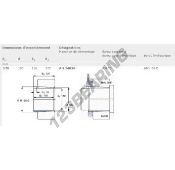 The Adapter Sleeve, known as AH24036-SKF SKF, has an inner diameter of 170 mm, an outer diameter of 180 mm and a thickness of 116 mm.