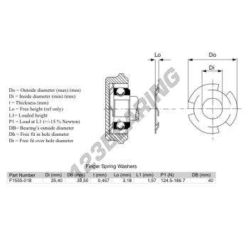 The Finger Spring Washer with the reference F1555-018 has an inner diameter of 25.4 mm, an outer diameter of 39.5 mm and a thickness of 0.457 mm.