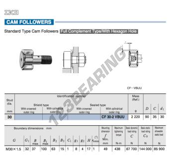 The Cam Follower, known as CFKR90-VUU-IKO IKO, has an inner diameter of 30 mm, an outer diameter of 90 mm and a thickness of 35 mm.
