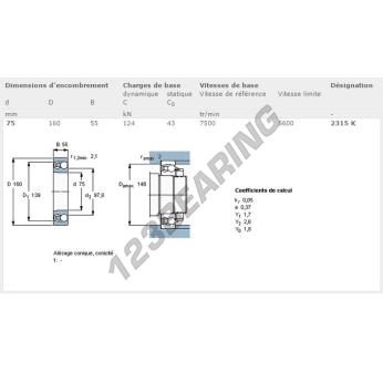 The Self Aligning Ball Bearing, known as 2315-K-SKF SKF, has an inner diameter of 75 mm, an outer diameter of 160 mm and a thickness of 55 mm.