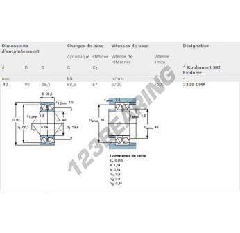 The Deep Groove Ball Bearing, known as 3308-DMA-SKF SKF, has an inner diameter of 40 mm, an outer diameter of 90 mm and a thickness of 36.5 mm.