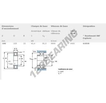 The Deep Groove Ball Bearing, known as 61836-SKF SKF, has an inner diameter of 180 mm, an outer diameter of 225 mm and a thickness of 22 mm.
