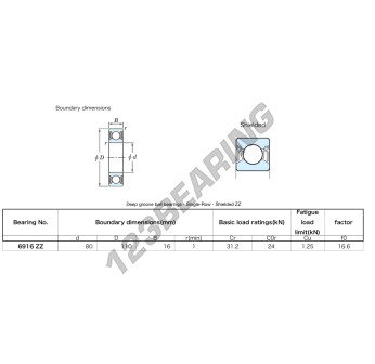 The Deep Groove Ball Bearing, known as 6916-ZZ-JTEKT JTEKT, has an inner diameter of 80 mm, an outer diameter of 110 mm and a thickness of 16 mm.