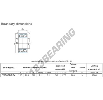 The Deep Groove Ball Bearing, known as 7030-BDT-FY-JTEKT JTEKT, has an inner diameter of 150 mm, an outer diameter of 225 mm and a thickness of 70 mm.