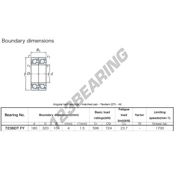 The Deep Groove Ball Bearing, known as 7236-DT-FY-JTEKT JTEKT, has an inner diameter of 180 mm, an outer diameter of 320 mm and a thickness of 104 mm.