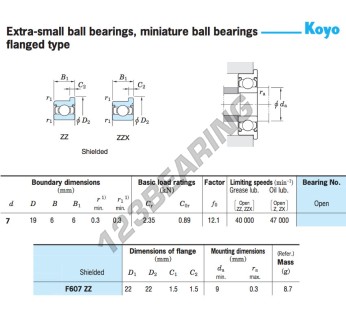 The Deep Groove Ball Bearing, known as F607-ZZ-JTEKT JTEKT, has an inner diameter of 7 mm, an outer diameter of 19 mm and a thickness of 6 mm.