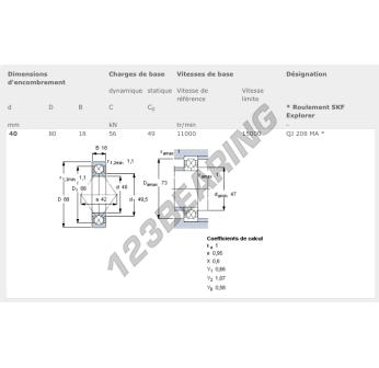 The Deep Groove Ball Bearing, known as QJ208-MA-SKF SKF, has an inner diameter of 40 mm, an outer diameter of 80 mm and a thickness of 18 mm.