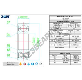 The Deep Groove Ball Bearing, known as R14-2Z-ZEN ZEN, has an inner diameter of 22.2 mm, an outer diameter of 47.6 mm and a thickness of 12.7 mm.