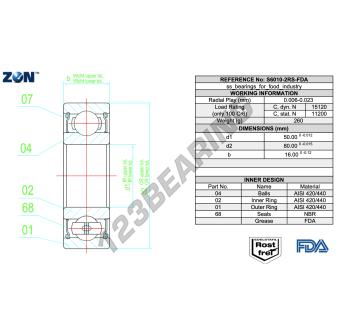 The Deep Groove Ball Bearing, known as S6010-2RS-FDA-AISI420-ZEN ZEN, has an inner diameter of 50 mm, an outer diameter of 80 mm and a thickness of 16 mm.