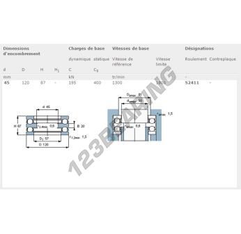 The Thrust Ball Bearing, known as 52411-SKF SKF, has an inner diameter of 45 mm, an outer diameter of 120 mm and a thickness of 87 mm.