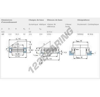 The Thrust Ball Bearing, known as 53312-SKF SKF, has an inner diameter of 60 mm, an outer diameter of 110 mm and a thickness of 38.3 mm.