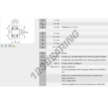 The Track Roller, known as LFR22-8-6-2RSR-NA-INA INA, has an inner diameter of 8 mm, an outer diameter of 24 mm and a thickness of 14 mm.