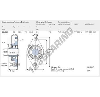 The Housed Bearing - 2 Bolts known as FYT7-8-RM-SKF SKF has a shaft diameter of 22.23 mm and a fixing spacing of 98.8 mm. This part number is produced in cast iron and the tightening type is .