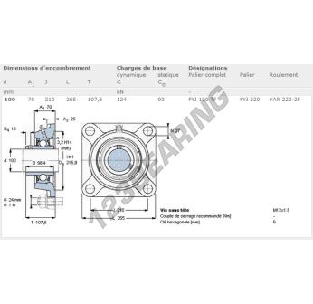 The Housed Bearing - 4 Bolts known as FYJ100TF-SKF SKF has a shaft diameter of 100 mm and a fixing spacing of 210 mm. This part number is produced in cast iron and the tightening type is .