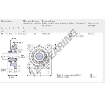 The Housed Bearing - 4 Bolts known as FYJ60-KF-SKF SKF has a shaft diameter of 55 mm and a fixing spacing of 143 mm. This part number is produced in cast iron and the tightening type is .
