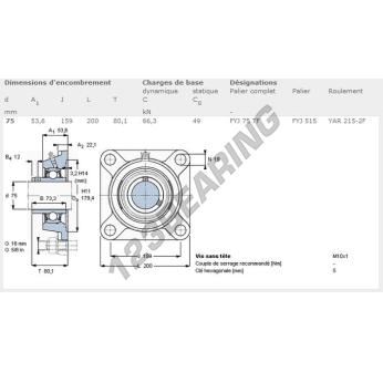 The Housed Bearing - 4 Bolts known as FYJ75-TF-SKF SKF has a shaft diameter of 75 mm and a fixing spacing of 159 mm. This part number is produced in cast iron and the tightening type is .
