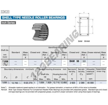 The Drawn Cup Needle Roller Bearing, known as BAM56-IKO IKO, has an inner diameter of 7.94 mm, an outer diameter of 12.7 mm and a thickness of 9.52 mm.