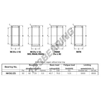 The Needle Roller Bearing, known as NK5025A-JTEKT JTEKT, has an inner diameter of 50 mm, an outer diameter of 62 mm and a thickness of 25 mm.