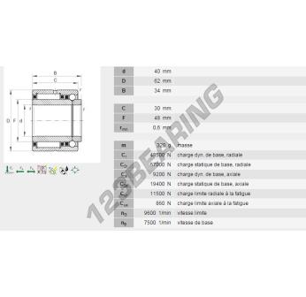 The Needle Roller Bearing, known as NKIB5908-INA INA, has an inner diameter of 40 mm, an outer diameter of 62 mm and a thickness of 34 mm.