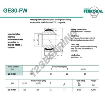 The Rod End Geew known as DGE30-FW-DURBAL DURBAL has an inside diameter of 30 mm, an outside diameter of 55 mm and a thickness of 20 mm.