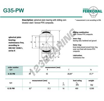 The Rod End Geew known as G35-PW-DURBAL DURBAL has an inside diameter of 35 mm, an outside diameter of 62 mm and a thickness of 28 mm.