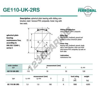 The Rod End Geew known as GE110-UK-2RS-DURBAL DURBAL has an inside diameter of 110 mm, an outside diameter of 160 mm and a thickness of 55 mm.