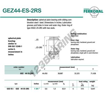 The Rod End Geew known as GEZ44-ES-2RS-DURBAL DURBAL has an inside diameter of 44.45 mm, an outside diameter of 71.438 mm and a thickness of 33.325 mm.