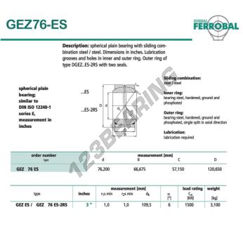 The Rod End Geew known as GEZ76-ES-DURBAL DURBAL has an inside diameter of 76.2 mm, an outside diameter of 120.65 mm and a thickness of 57.15 mm.