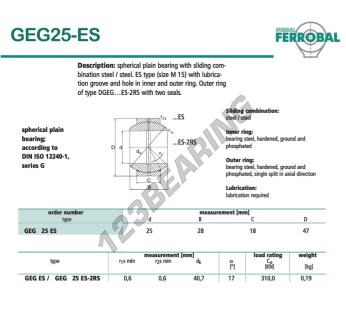 The Rod End Geg known as DGEG25-ES-DURBAL DURBAL has an inside diameter of 25 mm, an outside diameter of 47 mm and a thickness of 18 mm.