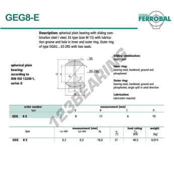 The Rod End Geg known as GEG8-E-DURBAL DURBAL has an inside diameter of 8 mm, an outside diameter of 19 mm and a thickness of 6 mm.