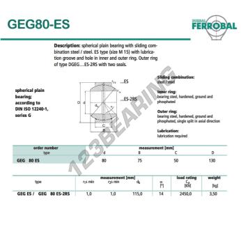 The Rod End Geg known as GEG80-ES-DURBAL DURBAL has an inside diameter of 80 mm, an outside diameter of 130 mm and a thickness of 50 mm.