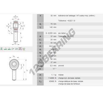 The Rod End Sa known as GAKR30PW-INA INA has a screw thread of , an inner diameter of 30 mm, an outer diameter of 145 mm and a thickness of 37 mm.