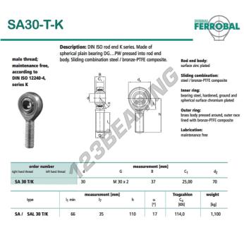 The Rod End Sa known as SA30-T-K-DURBAL DURBAL has a screw thread of , an inner diameter of 30 mm, an outer diameter of 70 mm and a thickness of 37 mm.