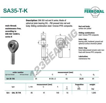 The Rod End Sa known as SA35-T-K-DURBAL DURBAL has a screw thread of , an inner diameter of 35 mm, an outer diameter of 81 mm and a thickness of 43 mm.