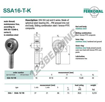 The Rod End Sa known as SSA16-T-K-DURBAL DURBAL has a screw thread of , an inner diameter of 16 mm, an outer diameter of 42 mm and a thickness of 21 mm.