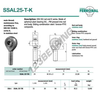 The Rod End Sa known as SSAL25-T-K-DURBAL DURBAL has a screw thread of , an inner diameter of 25 mm, an outer diameter of 60 mm and a thickness of 31 mm.
