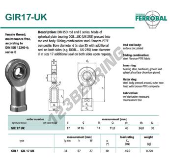 The Rod End Si known as GIR17-UK-DURBAL DURBAL has an inside diameter of 17 mm, an outside diameter of 46 mm and a thickness of 14 mm.