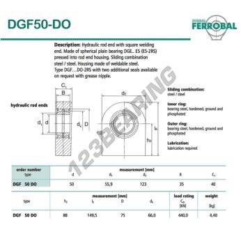 The Rod End Tpn known as DGF50-DO-DURBAL DURBAL has an inner diameter of 50 mm, an outer diameter of 123 mm and a thickness of 40 mm.