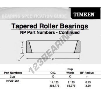 The Raw Cup, known as NP261254-TIMKEN TIMKEN, has an inner diameter of mm, an outer diameter of 358.775 mm and a thickness of 53.975 mm.