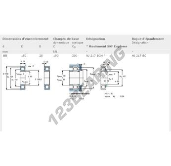 The Roller Bearing, known as NJ217-ECM-SKF SKF, has an inner diameter of 85 mm, an outer diameter of 150 mm and a thickness of 28 mm.