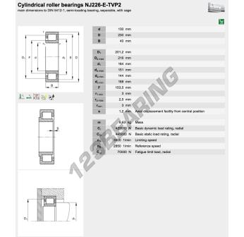 The Roller Bearing, known as NJ226-E-TVP2-FAG FAG, has an inner diameter of 130 mm, an outer diameter of 230 mm and a thickness of 40 mm.