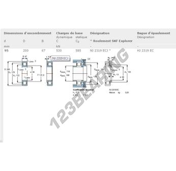 The Roller Bearing, known as NJ2319-ECJ-SKF SKF, has an inner diameter of 95 mm, an outer diameter of 200 mm and a thickness of 67 mm.