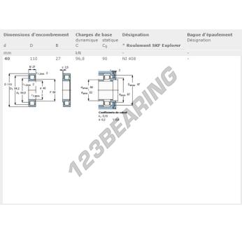 The Roller Bearing, known as NJ408-SKF SKF, has an inner diameter of 40 mm, an outer diameter of 110 mm and a thickness of 27 mm.
