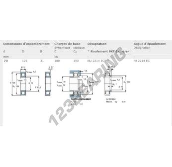 The Roller Bearing, known as NU2214-ECP-SKF SKF, has an inner diameter of 70 mm, an outer diameter of 125 mm and a thickness of 31 mm.