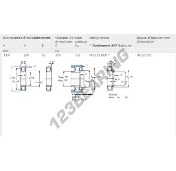 The Roller Bearing, known as NU222-ECP-SKF SKF, has an inner diameter of 110 mm, an outer diameter of 200 mm and a thickness of 38 mm.