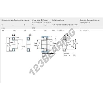The Roller Bearing, known as NU2318-ECP-SKF SKF, has an inner diameter of 90 mm, an outer diameter of 190 mm and a thickness of 64 mm.