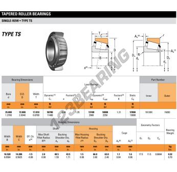 The Tapered Roller Bearing, known as 19138X-19283-TIMKEN TIMKEN, has an inner diameter of 35 mm, an outer diameter of 72 mm and a thickness of 17.018 mm.