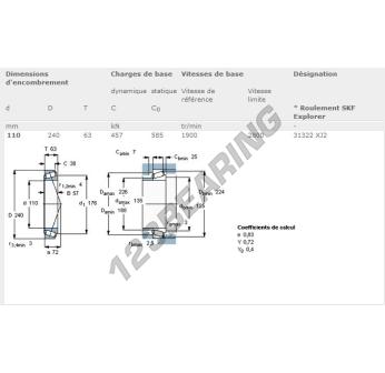 The Tapered Roller Bearing, known as 31322XJ2-SKF SKF, has an inner diameter of 110 mm, an outer diameter of 240 mm and a thickness of 63 mm.