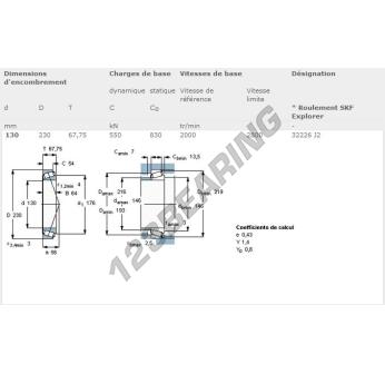 The Tapered Roller Bearing, known as 32226J2-SKF SKF, has an inner diameter of 130 mm, an outer diameter of 230 mm and a thickness of 67.75 mm.