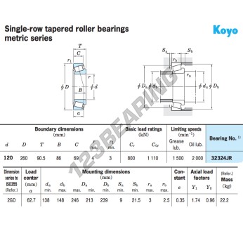 The Tapered Roller Bearing, known as 32324-JR-JTEKT JTEKT, has an inner diameter of 120 mm, an outer diameter of 260 mm and a thickness of 90.5 mm.